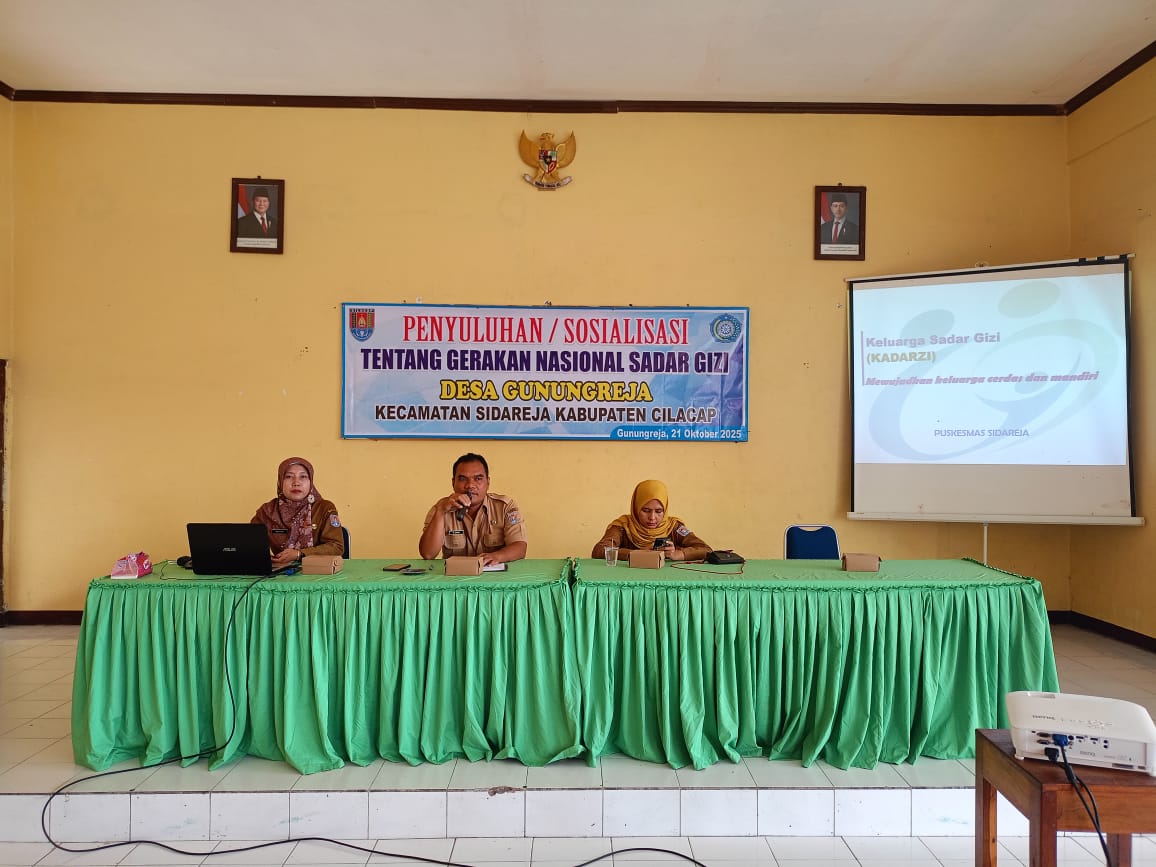 Gunungreja, 21 Oktober 2025 – Pemerintah Desa Gunungreja menggelar kegiatan Penyuluhan/Sosialisasi Gerakan Nasional Sadar Gizi yang bertempat di Aula Desa Gunungreja. Kegiatan ini bertujuan untuk meningkatkan pemahaman masyarakat mengenai pentingnya pemenuhan gizi seimbang demi tercapainya kualitas hidup yang lebih baik.